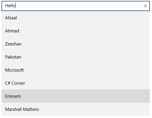 Now if you look at it, you will see that it does provide us with some suggestions. But those suggestions are not related to our query at all. We are not interested in Afzaal, Ahmad or even Zeeshan. All we are interested in are records for "Hello", such as "Hello world". But this control is showing us all of the records, the entire list. We need to update this problem and ensure that our list is shown depending on the query of the user. A little hack, an easy one, is shown in the following: