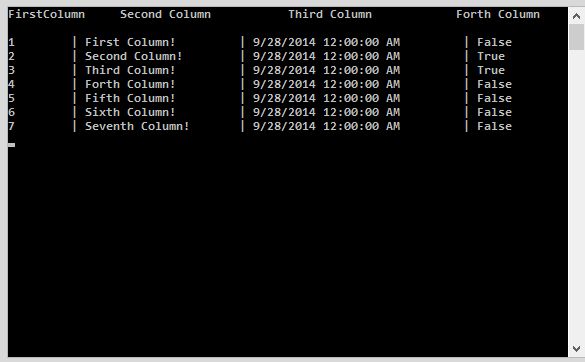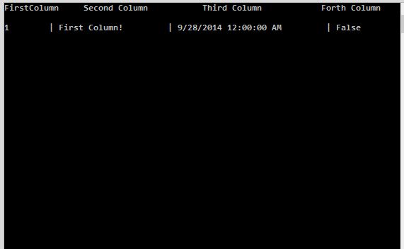 - Console.WriteLine("FirstColumn\tSecond Column\t\tThird Column\t\tForth Column\t");