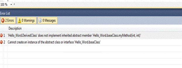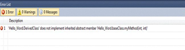 Now let's see what happened when we do take our implementation method out of the derived class and comment the calling part of the code. Here we go.