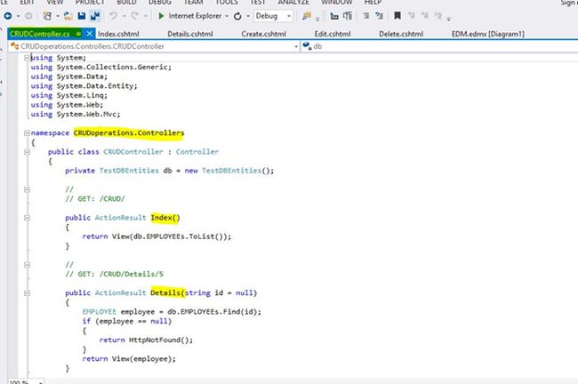 It will redirect you to a page named "CRUDcontroller.cs" (as I modified it). This page contains all the CRUD operation related functions and two others, such as: