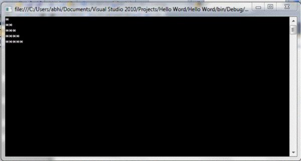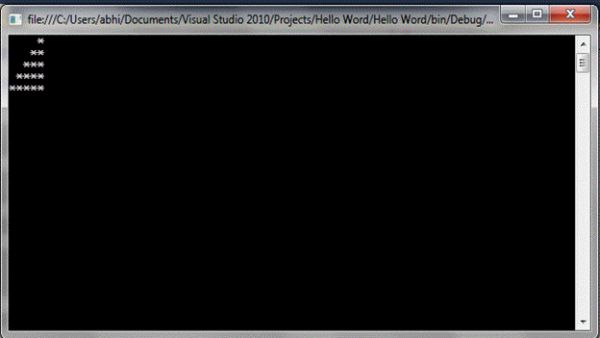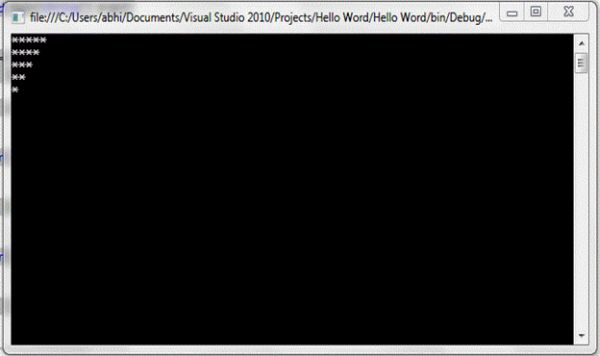 Triangle: 2The triangle in this category is just the opposite of the first type of triangle patterns. There is no difficulty in applying loops for them, what we need to do is to make some little changes in the for loop conditions and it will work fine.
