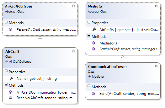 In the preceding example the mediator tells the subscribed aircrafts (except the sender) that one of them is saying something.