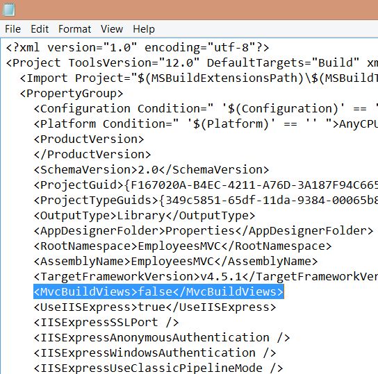 Look for <MvcBuildViews>false</MvcBuildViews>.