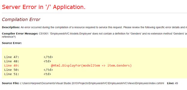 Look at the output we got. Our application throws an exception at line 49. The reason for this exception is that our application does not contain a definition for Genders. Even after creating a strongly-typed view we were not able to identify the error.
