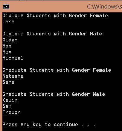 - Console.WriteLine("{0} Students with Gender {1} ", item.StudentType, item.Gender);