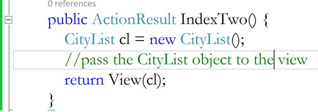Flip to HomeController and create an instance of this CityList class in the IndexTwo action method.