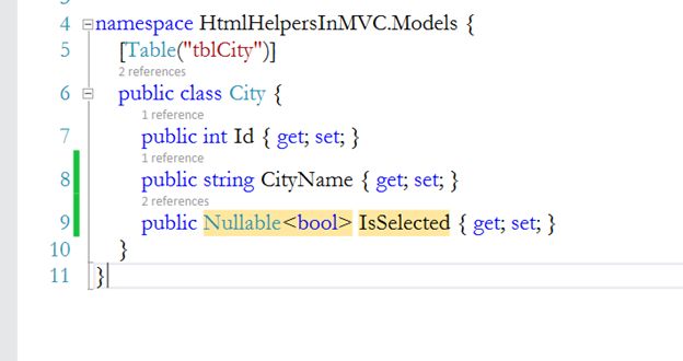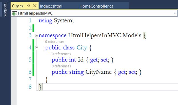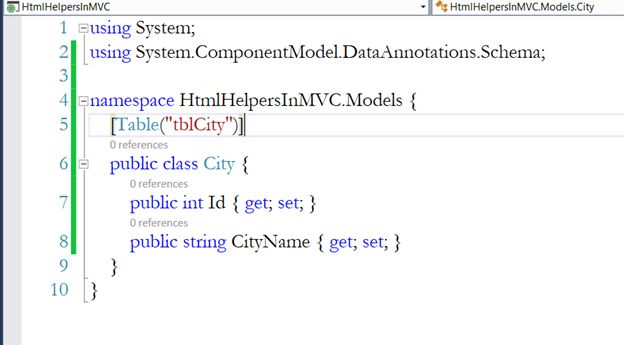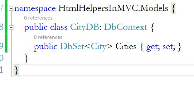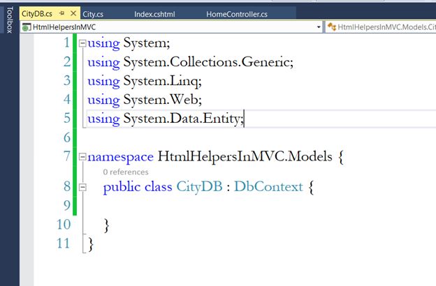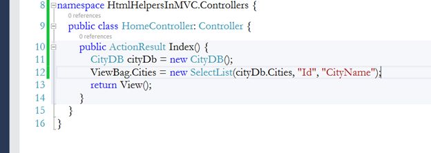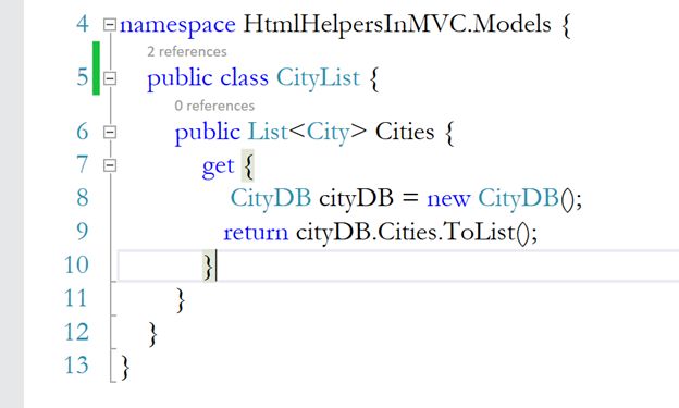 NOTE: This CityDB class is present in HtmlHelpersInMVC.Models and HomeController is present in HtmlHelpersInMVC.Controllers. So, before creating the instance of this class, we must import the namespace.