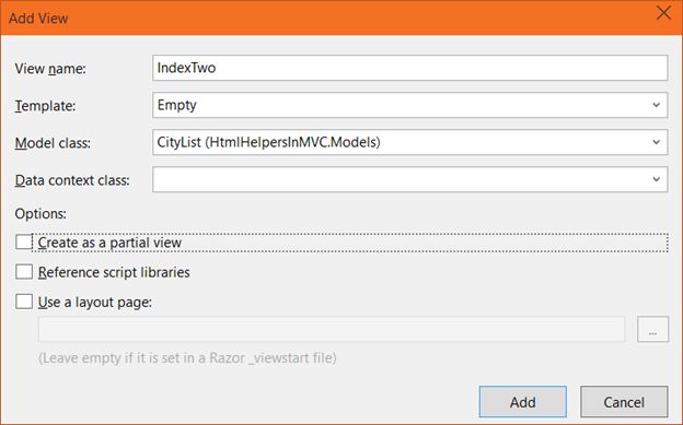 When IndexTwo.cshtml file is generated you will see at the top the model @model HtmlHelpersInMVC.Models.CityList that means it is a strongly-typed view.
