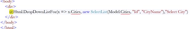 - @Html.DropDownListFor(x => x.Cities, new SelectList(Model.Cities, "Id", "CityName"),"Select City")