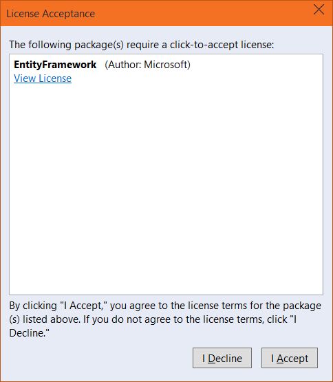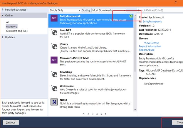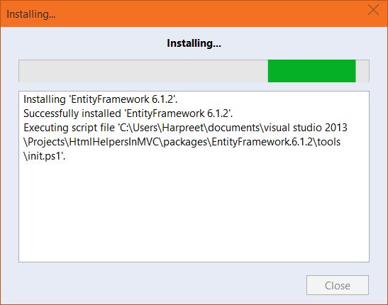 Once the installation is complete, you will see the Green mark sign at the top-right corner of EntityFramework. Click Close.