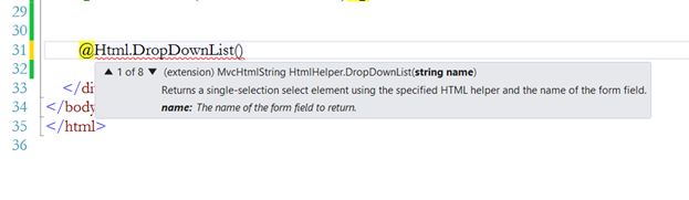 The next step is to create a dropdownlist using DropDownListFor HTML helper.