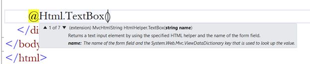 We can create the same TextBox control using a HTML helper and to create a TextBox using a HTML helper we say: