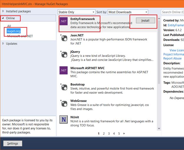 Expand the Online packages then select nugget.org then select Entity Framework then click Install.