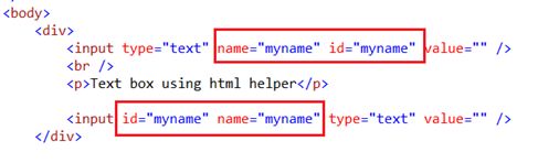 When we create a TextBox using a HTML element, we specify the name and id attribute but when we create a TextBox using a HTML helper all we need to do is specify a name and when this TextBox is rendered it uses this name value and assigns this value to the name attribute and id attribute.