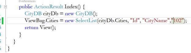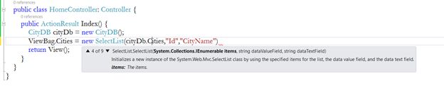 As we know this CityDb.Cities is a collection of list items. So, pass this item in the first parameter of the SelectList constructor, pass the Id as the DataValueField and CityName as the DataTextField.