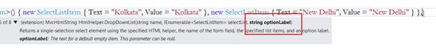 As we know a dropdownlist in MVC is a collection of SelectListItem objects and to add these objects we need to use the other overloaded version of this dropdownlist HTML helper.