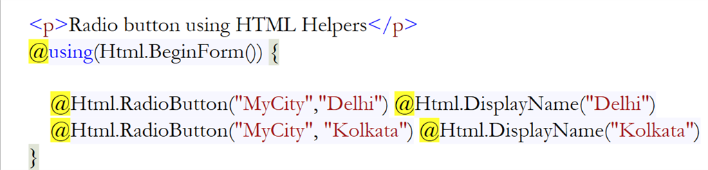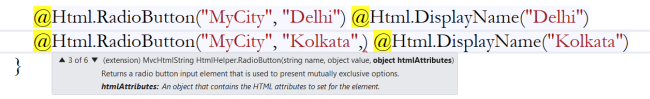 - @Html.RadioButton("MyCity","Delhi") @Html.DisplayName("Delhi")