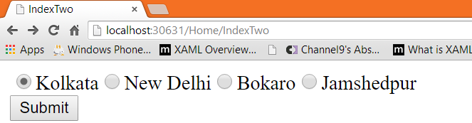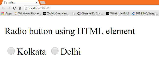 - <input type="radio" name="city" value="Kolkata" checked="checked" />Kolkata