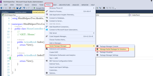 The first step is to install the Entity Framework and for that go to Tools -> NuGet Package Manager -> Manage NuGet Packages for Solution.