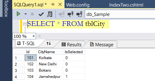 - <add name="CityDB" connectionString="server=.;database=db_sample;user=sa;password=sql" providerName="System.Data.SqlClient"/>