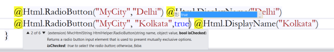 - @Html.RadioButton("MyCity", "Kolkata", new { @checked = "checked" }) @Html.DisplayName("Kolkata")
