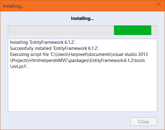 Once the installation is complete, you will see the Green mark sign at the top-right corner of EntityFramework. Click Close.