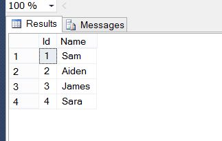 - INSERT INTO IdentityTable(Name) VALUES ('Sam'),('Aiden'),('James'),('Sara');