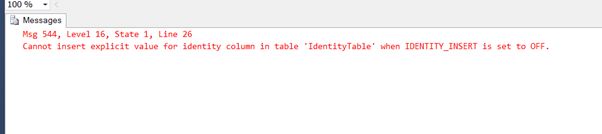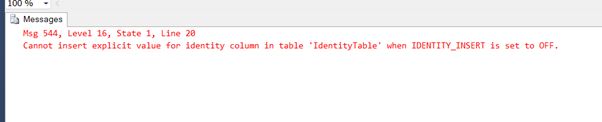 We get an error. So, when a column in a table is an identity column then we won't be able to insert the values for that column explicitly.