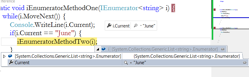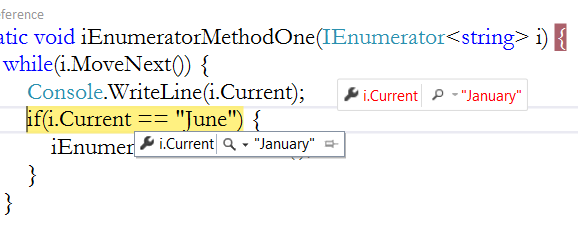 - In the if block we are checking the current item state, if the item is “June” then we invoke the second iEnumerator method and in that method we passed the IEnumerable of string object. In other words, i.