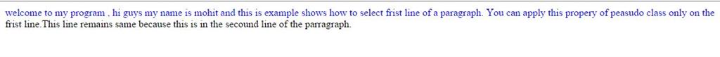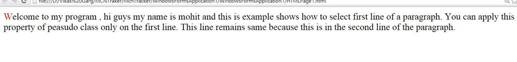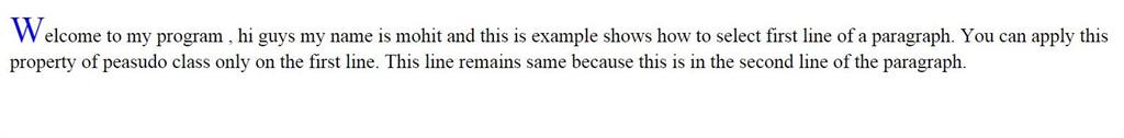 - You can apply this property of Pseudo class only on the first line. This line remains same because this is in the second line of the paragraph.</p>