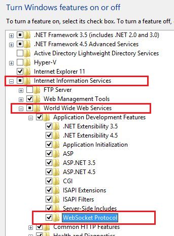 Go to Control Panel and search program and then click on Turn Window features on or off, then you find Internet Information Services and then World Wide Web services. You will now see the Web socket protocol. Also have the web socket features.