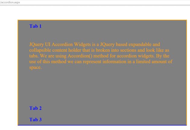 Example: In this example we can see how to use Accordion method for managing information for a little amount of space, information are stored into multiple section and each section can open afar clicking on new tab like the following example.