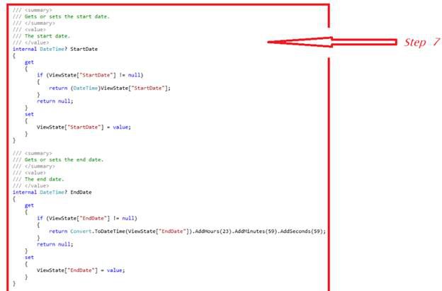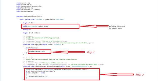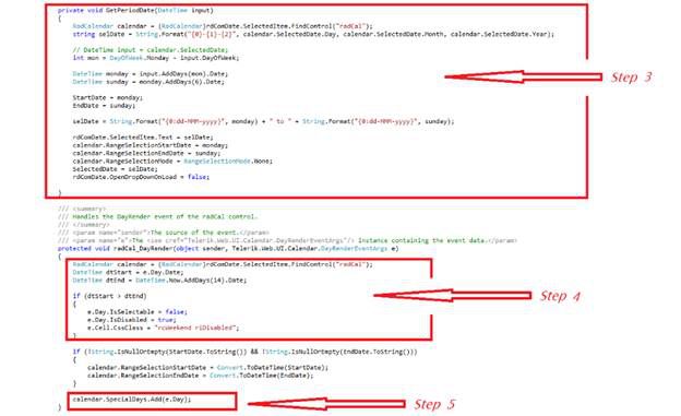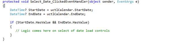 Write the event logic for the SelectedDate Change event on the calendar that will get the selected period of date.