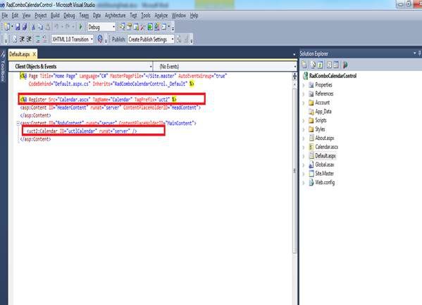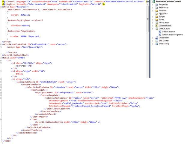 Under the User Control calendar.ascx, design the page by placing a rad combo box and Telerik calendar with your default selection of the style for the calendar.