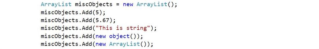 Elements of various types can be added to the ArrayList. Further, we do not need to concern ourselves with redimensioning the ArrayList. All of this is handled automatically for us. An example of the ArrayList in action can be seen in the code snippet below.