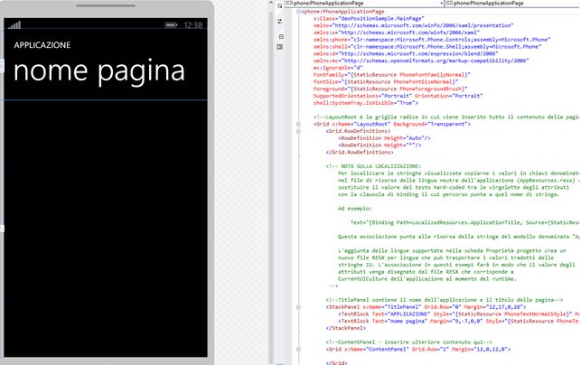 On the left of the image is the graphic interface, whereas you insert or controls from the Toolbox, or XAML, we will show a preview of what our application will be. On the right the XAML code GUI. Since this is an empty application we have no control except for the part where they appear, "application" is "page name".