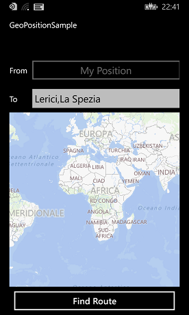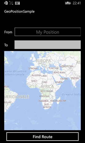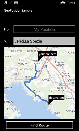 The screen consists of two TextBlock controls with the values "Form" that is our position, "To" where we will enter the destination you want to view, control Maps on which will track the path that we display and finally a button called "Find route" that the tap will execute the code that we saw earlier. Now we type a location in the TextBox beside the word "To" as shown in the figure.