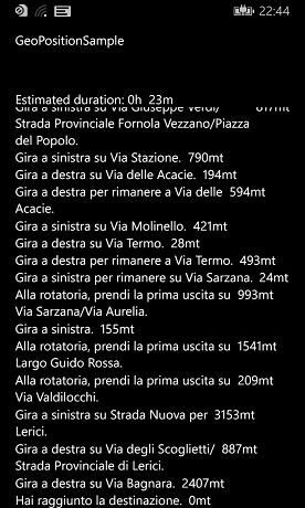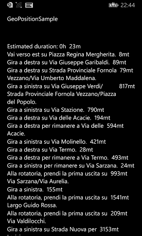 It was redefined the GUI by adding a Pivot control, a sort of container with one or more tabs, where each tab is represented by a PivotItem. The screen 1.1 and included in the first PivotItem, whereas in the second we entered PivotItem a ListBox in binding with a class called RouteInformation, who will show in detail all the directions to the destination plus the estimated travel time. In RouteTravel.xaml.cs file, let's change the code of tap of the button btnFindCoordinate as follows.