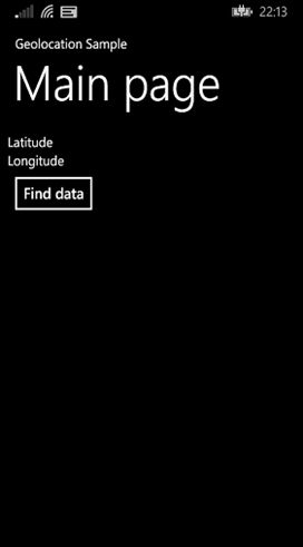 We have four TextBlock controls that were used to display the latitude and longitude using the tap on the Button control named Find data. Open the project with Visual Studio 2013; I remember that this example was created with the Professional version. In exploring solutions, double-click with the mouse on the MainPage.xaml file. In the GUI, go to delete all the controls from the main grid called ContentPanel and insert the following code.