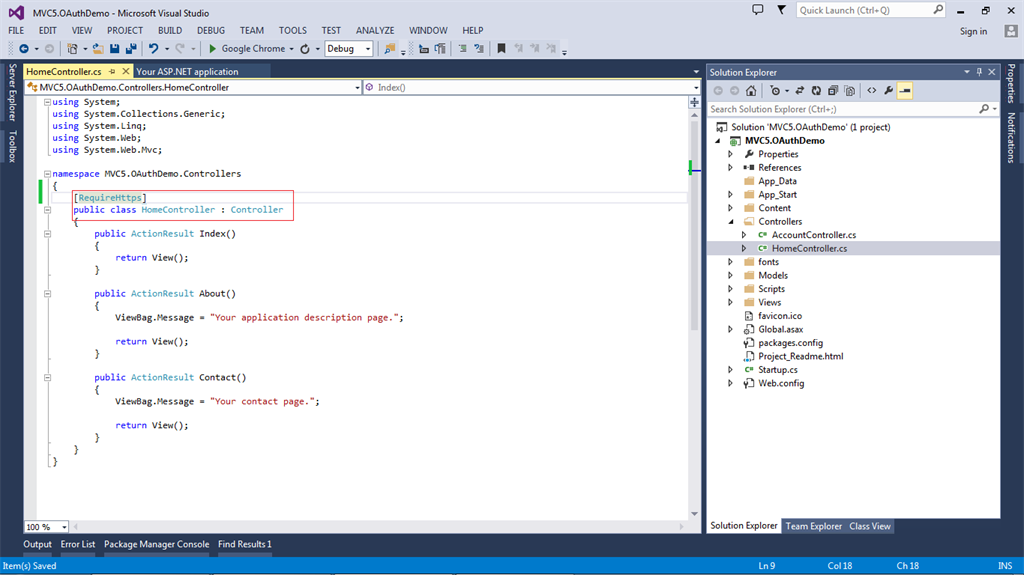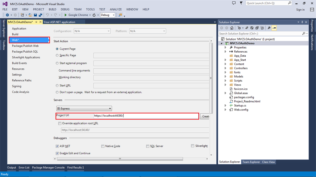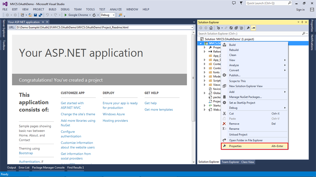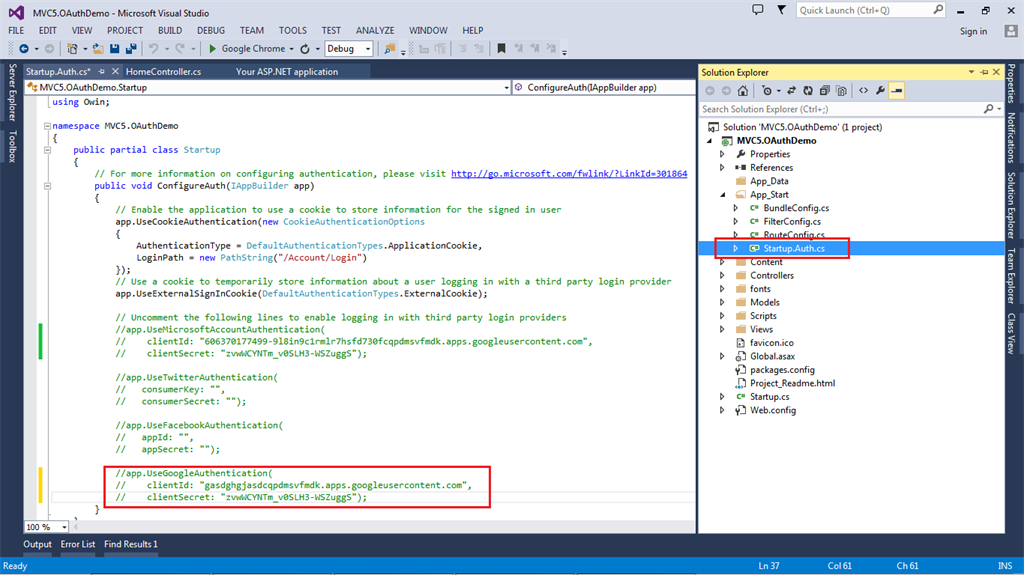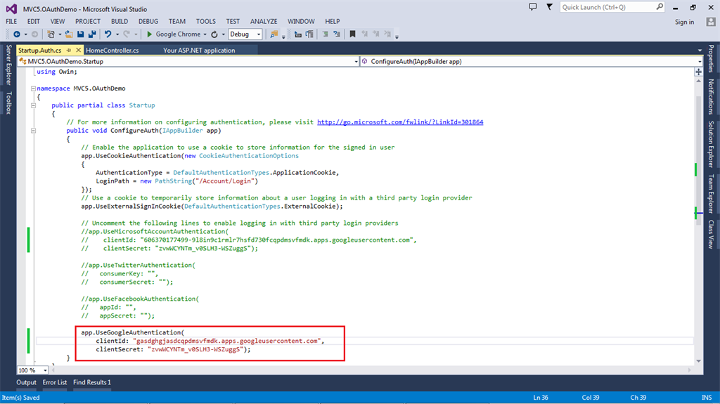 Now the last step is to configure the project for OAuth logins. Use that Client ID and Client Secret key to create our MVC application.