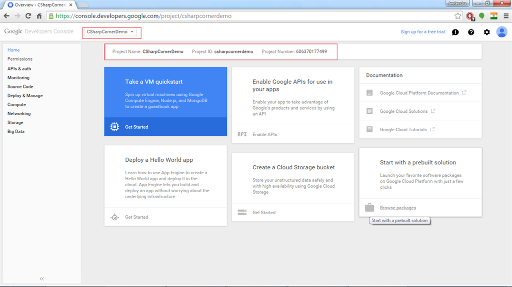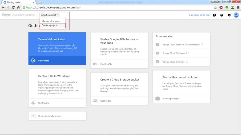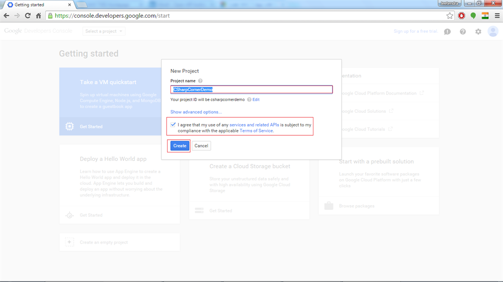To create a new project, click on Create a Project, provide the name and select the terms and conditions then click on Create.