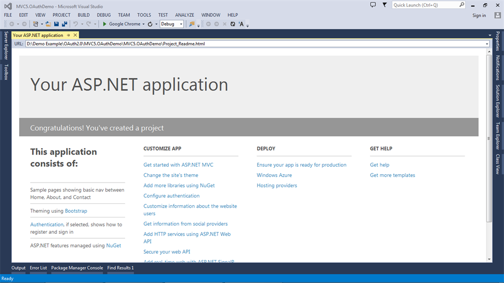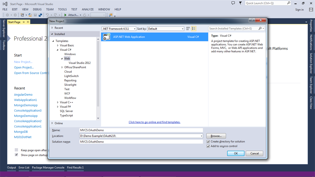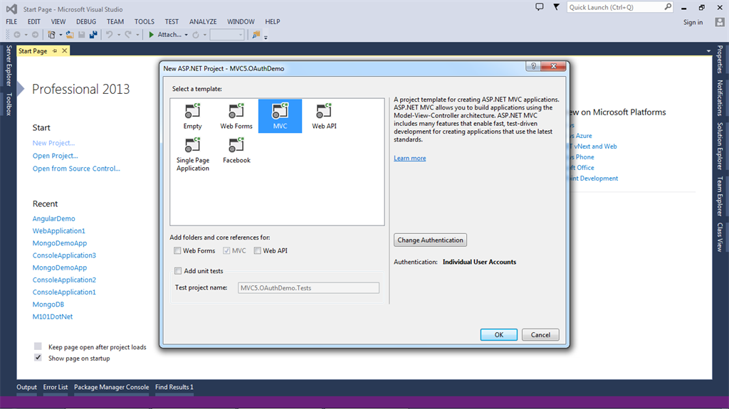 Provide the name for your application like "MVC5.OAuthDemo". Click OK.