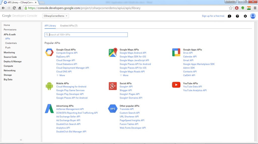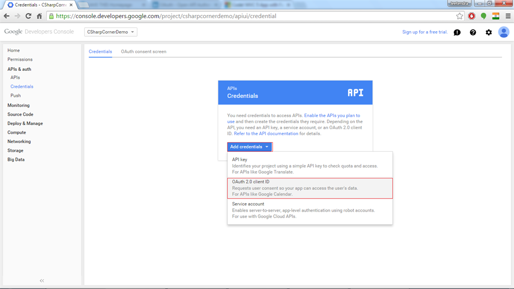 Click on the left side menu option. Click on APIs and auth -> credentials.