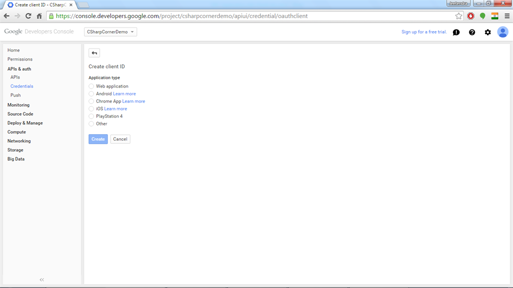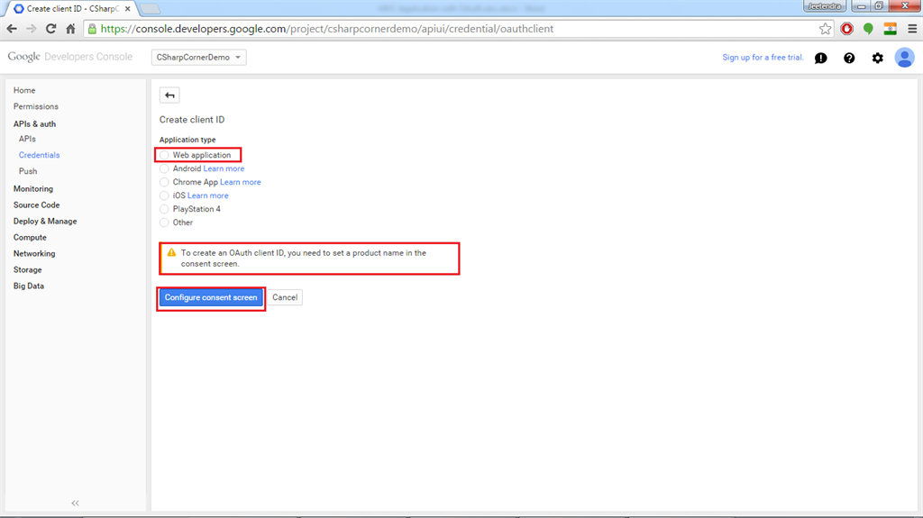 Select Web Application here, but we didn’t set the Product name. You can see in the preceding image that there is notification for that, click on Configure Consent Screen.