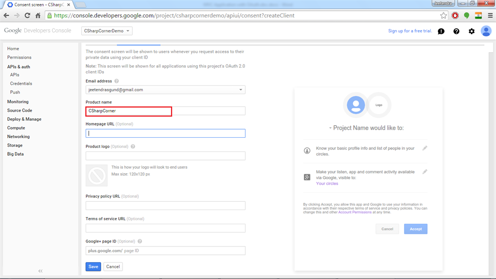 After login, it will ask for permission with our product name CSharpCorner. Click Accept.