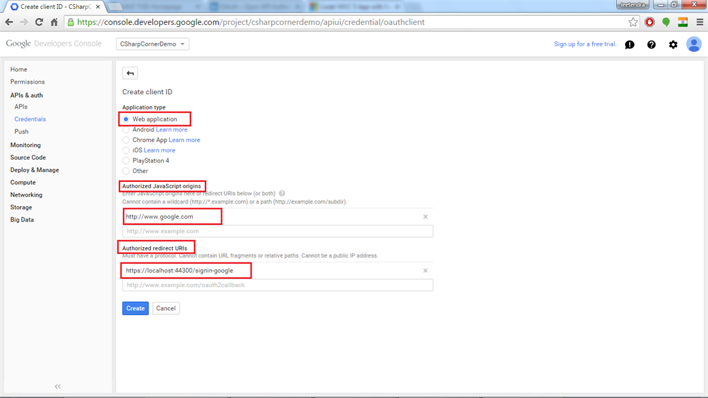 In the preceding image you can see I entered Authorized JavaScript origins to Google and Authorized redirect URIs to https://localhost:44300/signin-google and click on the Create button.