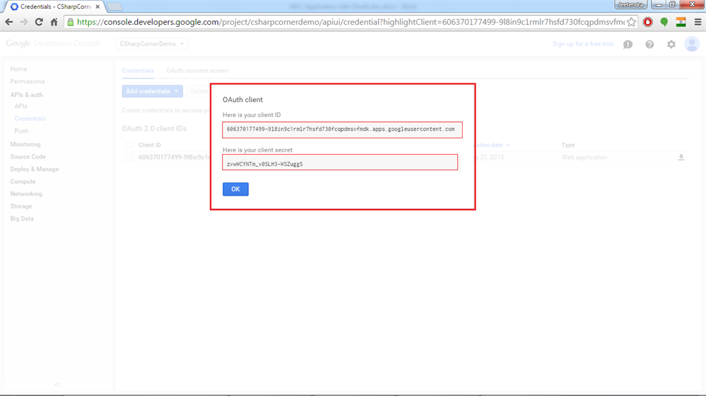 After clicking the create button it generates the OAuth Client ID and Client Secret key for use in our application. Note the client ID and secret key and click OK.