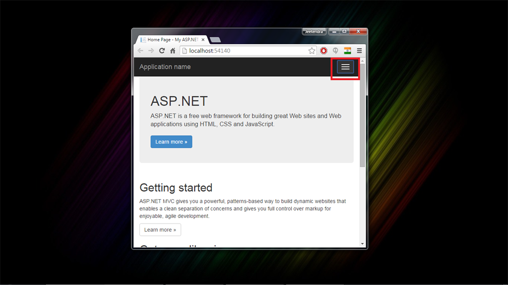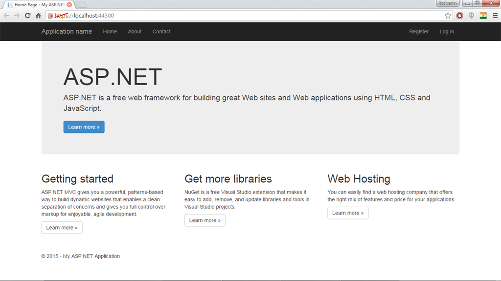 Congratulations, your MVC 5 application ran successfully. Click on restore down the browser page you can see like following: