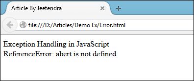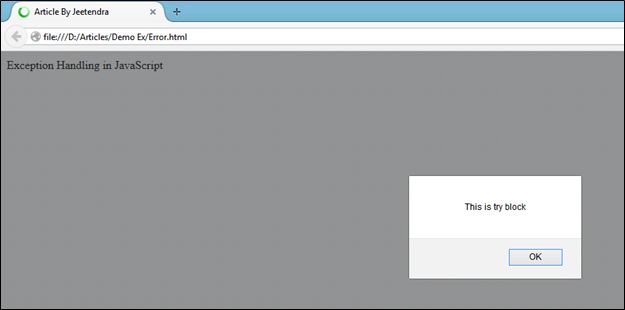 When you execute this program it will first show an alert message box with the message “This is try block”. When it executes the next statement it is an error because there is no alert message box available for this exception catch by catch block and it prints the error object of the catch block. It will print the proper exception message like the following output: