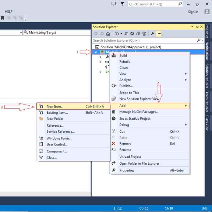 - It will open a new window. Select data from the left side, then select ADO.NET Entity Data Model and name it ‘ModelFirst’ and finally click Add.